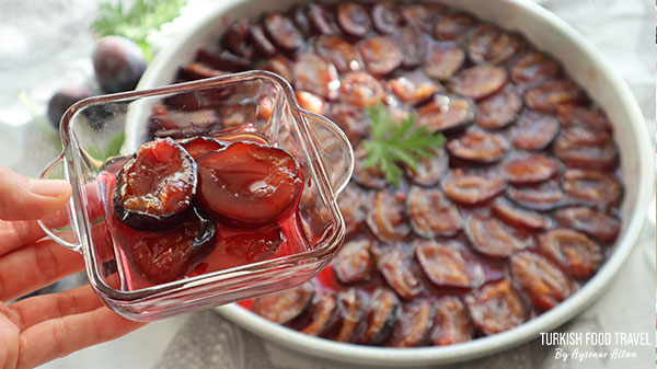 Bake in 160C degree oven for about an hour. Check after it releases its juice. From time to time drizzle the juice over the plums or tilt the tray to let the juice touch to the plums.
