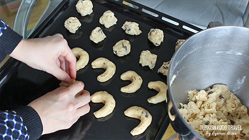 - Get walnut-size pieces and roll between your palm and bend to make a crescent shape. Place on a baking tray. You can shape the dough into balls and freeze it in a container and cook without thawing another time.