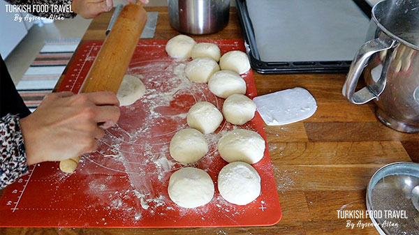 - Transfer the dough into a floured surface. Make a log and cut into 12 pieces. Shape the pieces into rounds and cover it with a damp cloth.