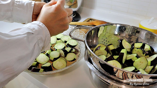 - Wash the eggplants, cut the stems out and peel in strips. Slice them in less than 2 cm thickness and soak in salty water for at least 45 minutes using 2 tsp salt and water to cover them all.