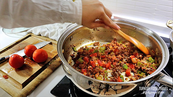 - Sauté diced onion on heated olive oil for 2-3 minutes. Add minced meat and continue to sauté until the meat’s color turns and the juice is evaporated.