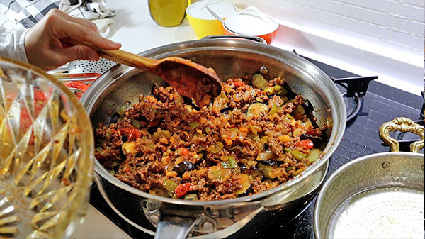 - Place the meat mixture over the fried eggplants. Slice tomatoes and arrange over the meat mixture. Add enough hot water not to cover the dish but a little less.