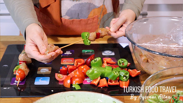 - To a wooden or metal skewers, arrange alternately from chicken and peppers. Don’t place them stiff, so they can cook evenly. Before you begin grilling the chicken shish, if you want you can prepare the salad to serve them as hot as possible.