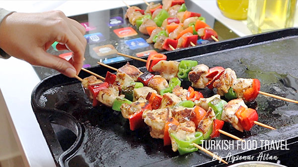 Chicken shish kebab is a cubed chicken breast meat placed in wooden or metal skewers alternately with vegetables like peppers and tomatoes. It is grilled and served with flatbreads, salads, or pilav.