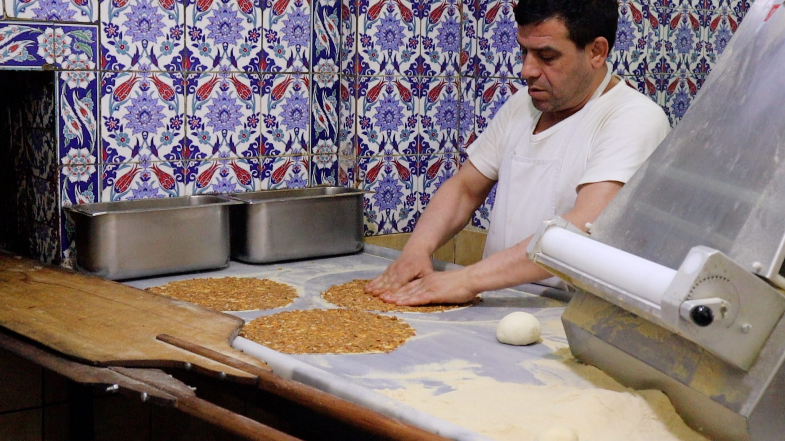 Often nicknamed by tourists Turkish pizza: The name comes from an originally Arabic name. “Lahm” means meat and “Ajeen” means dough. So it’s made from vegetable and meat mixture and dough.