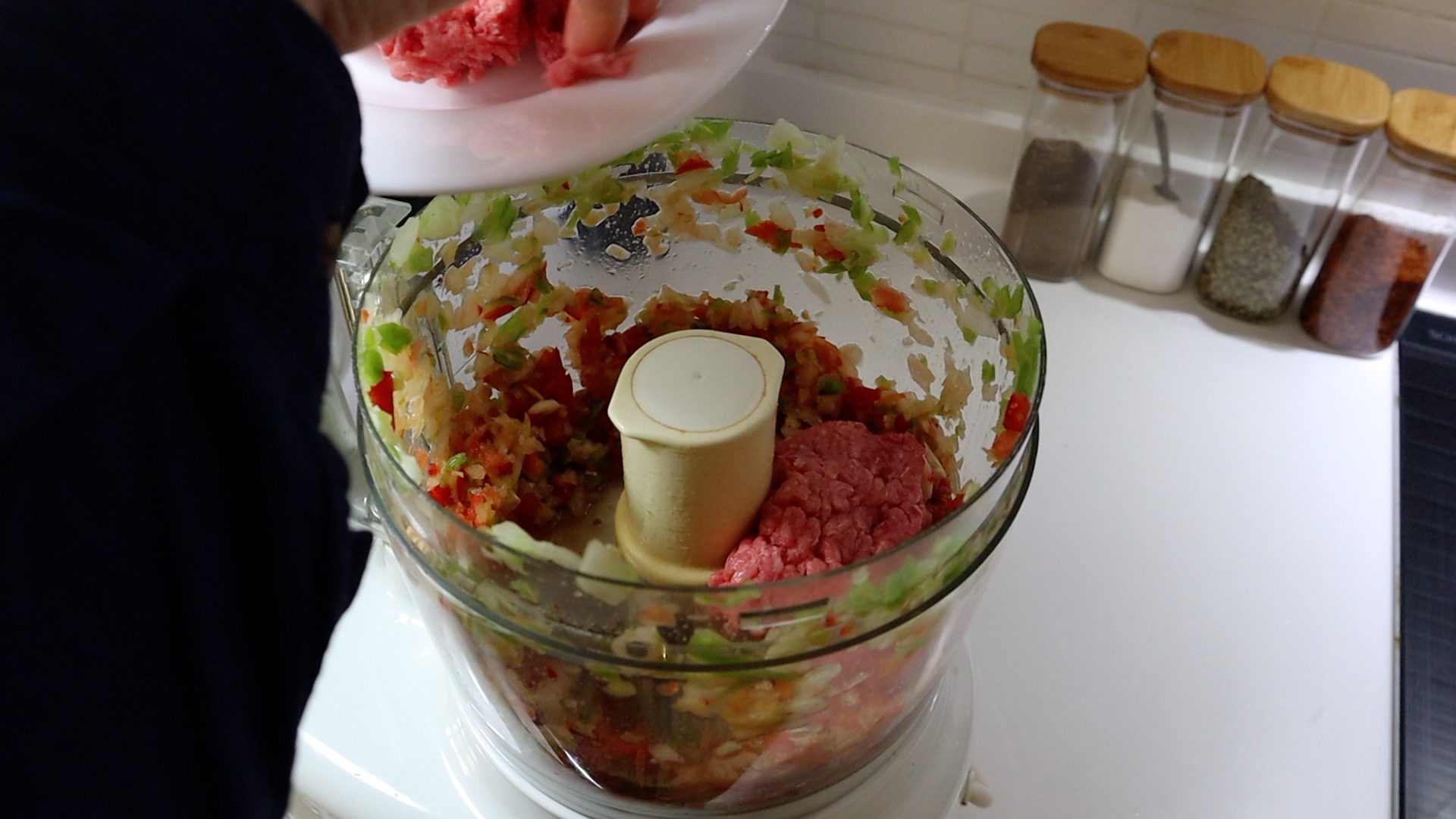 - In a food processor, finely chop one onion, green and red peppers, and garlic.