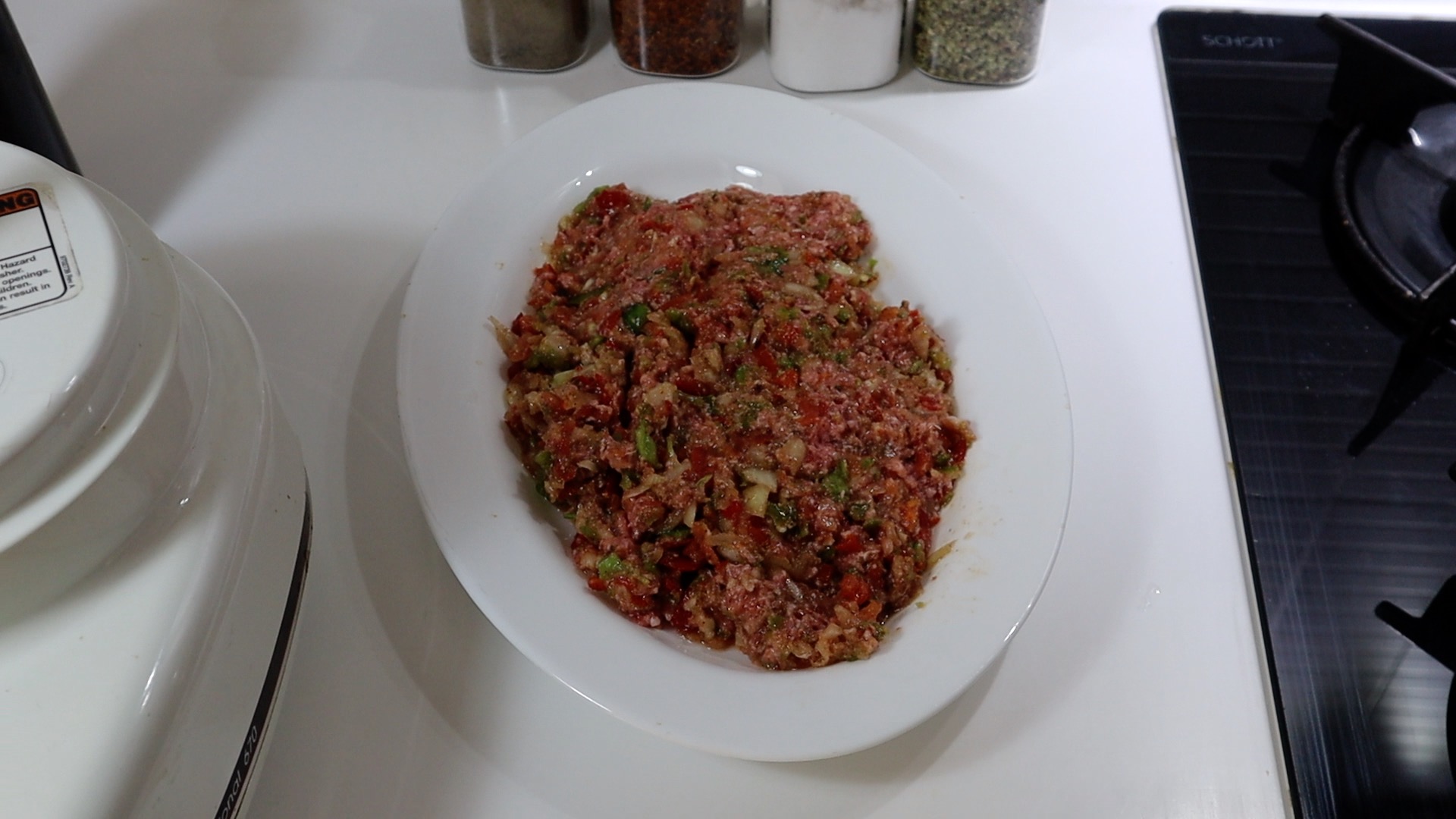 - Combine this mixture with minced meat and season with salt, paprika, black pepper, and a bit of olive oil.