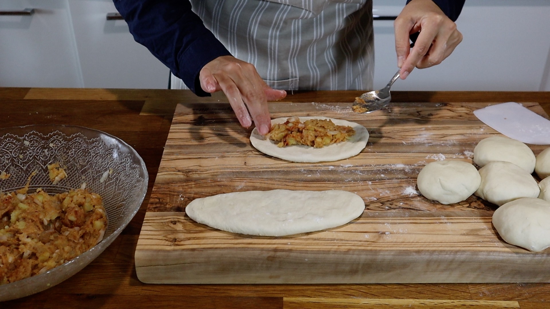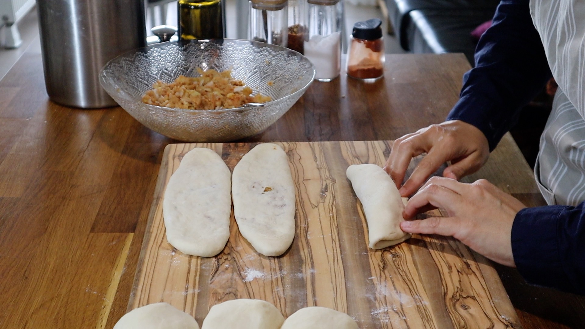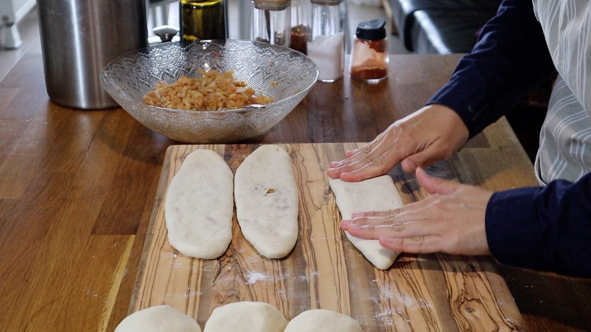- Take one of the dough balls and, by hand, shape it into an oval as you see in the video. Place your preferred filling along the center of the oval.