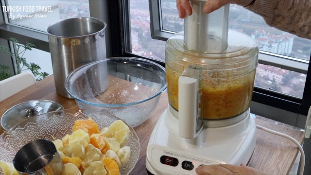 - In a food processor or blender, first process the citrus peels with some of the chopped fruit.