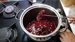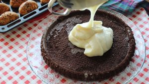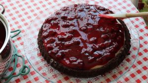 I used a tart cake pan for it that has a well in the center. Makes it easy to assemble and with the cherry sauce together looks pretty too. But you can of course use a regular medium size deep-dish pan and built up the layers on top