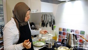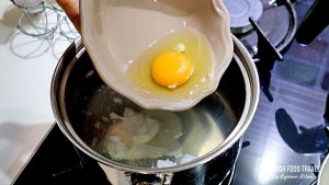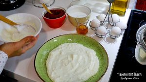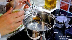 After eggs are cooked, drain them with a slotted ladle and place them into the yogurt base. Some people prefer to drain the eggs in a paper towel. I think a little bit of water is fine rather than having fine microtissues of paper in your meal 🙂