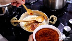 While cooking the eggs, make the butter & red pepper sauce: Melt the butter or oil in a small saucepan. After adding the red pepper flakes as much as you like stir for about 20 seconds to infuse the pepper into the butter and turn off the heat.