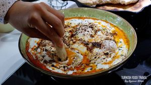 Drizzle the sauce over the eggs and yogurt base. Sprinkle dried mint if you like and enjoy it with fresh bread like pide, bazlama, or your favorite one.