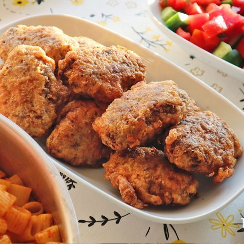 The recipe comes from Ottoman times. Interestingly, it has cooked rice, sautéed minced meat, and raw minced meat in the mixture. After the spices, it is shaped and coated with egg and deep-fried.