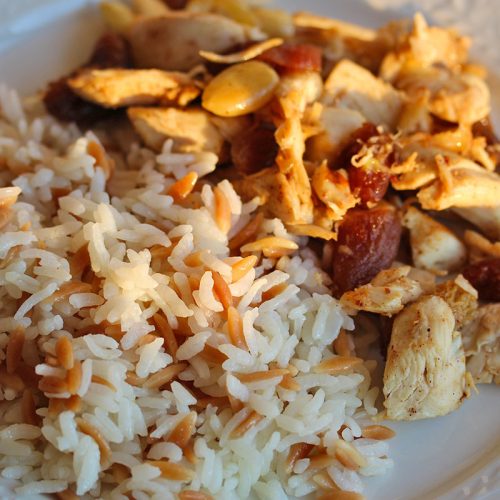 Turkish pilaf with orzo “Şehriyeli Pilav” is our favorite side dish at home that goes well with almost any Turkish dish. With browned orzo in butter, it has a nutty taste and with hints, it is very fluffy.