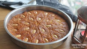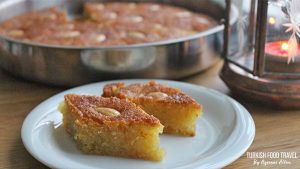 Turkish cake “Sambali” dessert with syrup made with semolina and has no egg, flour, and oil in it. Similar to basbousa or what we call in Turkey “Revani”. It is also one of the sweets sold on the Turkish streets… This easy to make traditional Turkish dessert will be your favorite, don’t miss and try it 🙂